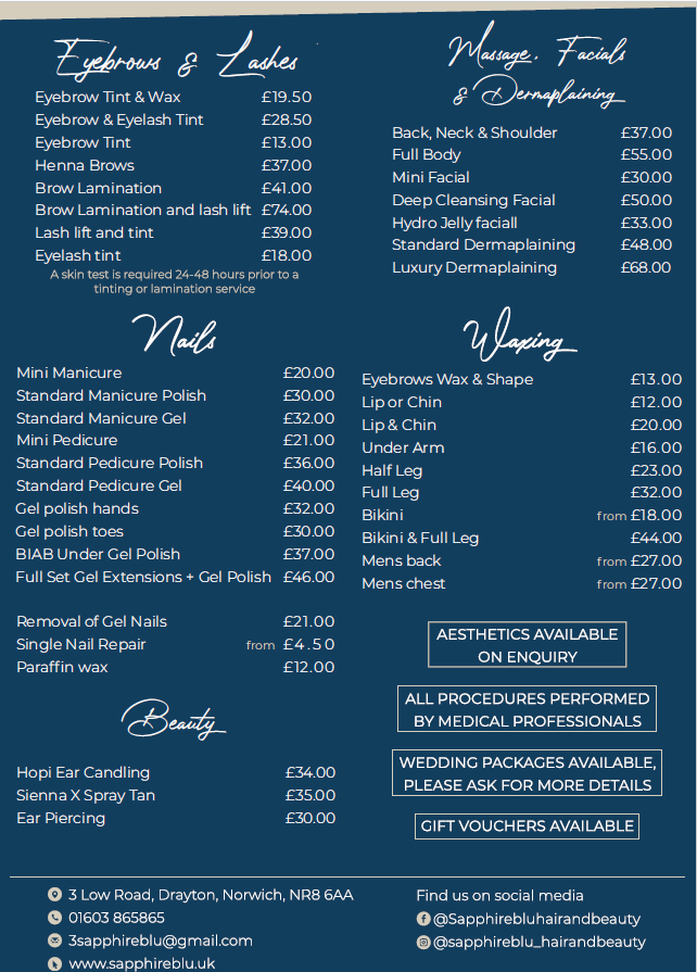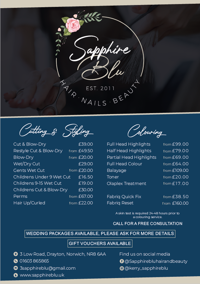 Sapphire Blu is a modern and friendly hair & beauty salon which was established in 2011. Now based in our lovely new salon in Drayton. We aim to create a pleasant and relaxing atmosphere for all our customers young and old.